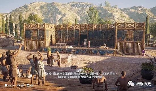 我们可以看到,古希腊剧场是,山羊唱歌队和乐队在前方表演,后方的高台上是戏剧演员们表演的地方。