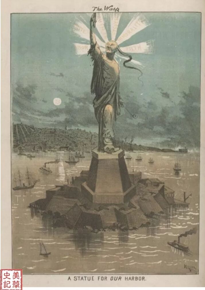用一个被极力丑化的华人形象代替自由女神,此画发表于1881年11月,正是在国会激烈讨论排华法案时。