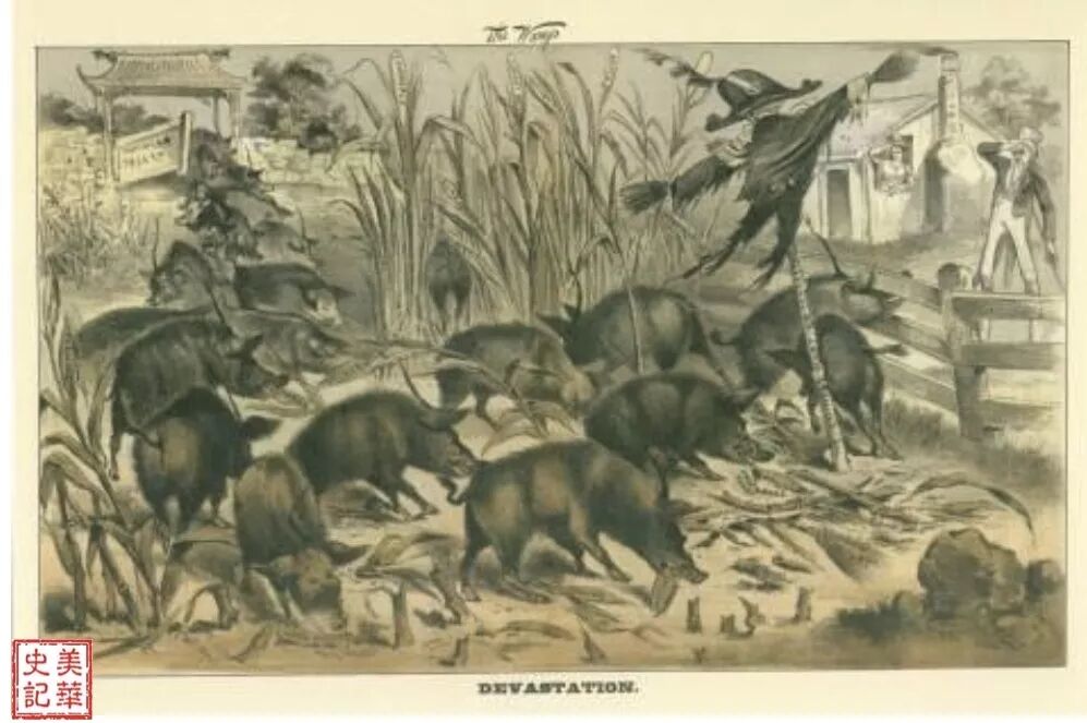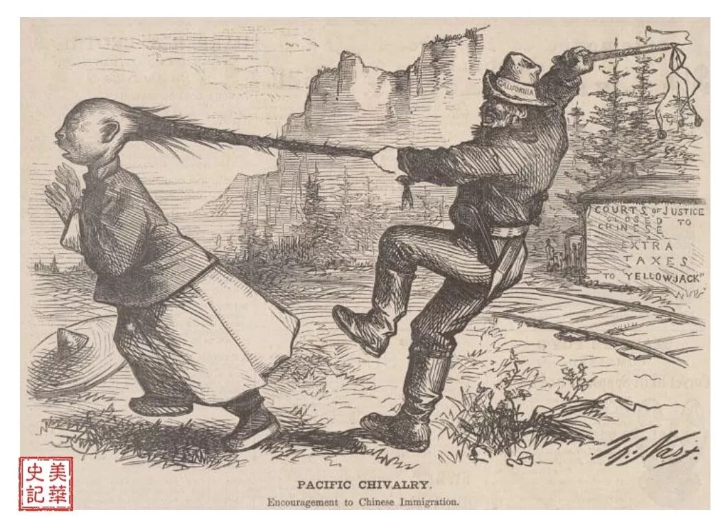 发表于1869年8月7日,这是纳斯特的第一幅华人移民题材的政治漫画,这位身在纽约的画家对远在美国西部倍受欺压的华工充满了同情。