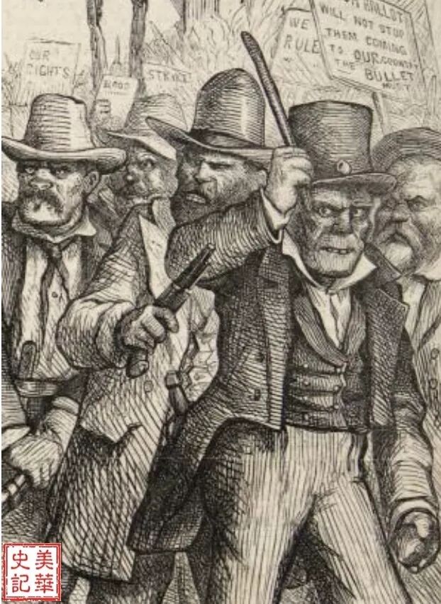看看纳斯特笔下的排华暴徒:面目狰狞,每人至少有两件武器:持枪握刀,手里握着石块,腰里还别着凶器。 右一是德裔美国人的形象,右二是爱尔兰人的模样。左一画的是个打手。
