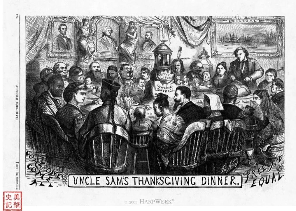 这幅漫画发表在1869年11月20日的哈珀周刊上。 标题是“山姆大叔的感恩节盛宴”,画的旁边写着:“宾至如归,自由平等”。 漫画家纳斯特赞扬族裔多元化和美国所有公民都应该享有平等的政治权利。每年的11月份最后一个礼拜四是美国的感恩节。画面是一场理想化的感恩节盛宴。山姆大叔(切火鸡那位)和哥伦比亚女神(最左边坐在黑人和中国人之间)主持这场宴会。