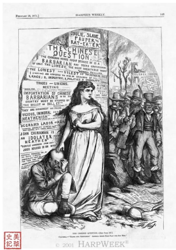 1871年2月18日哈珀周刊上刊出纳斯特这幅插图:哥伦比亚女神呼喊着“住手,绅士们!美国意味着人人平等!”画面上愁苦满面,孤独无助的华工蜷缩一隅。他岌岌可危的处境与杀声震天,人山人海的排华暴徒们的嚣张气焰形成鲜明对照。