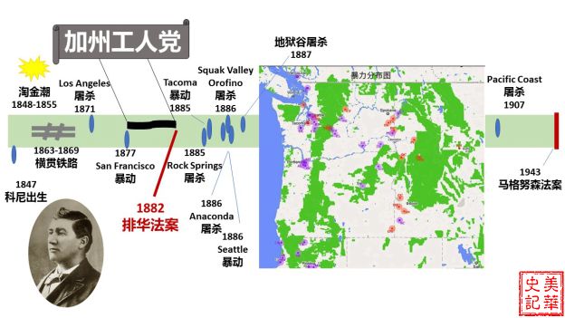 1882年至1943年的“排华法案”将华人的生活打到了社会最底层。伴随着“排华法案”的出台,美国尤其是在西北地区发生了大量针对华人的暴力攻击事件。图片中科尼图像取自[2],“暴力分布图”取自金三角地图http://www.cinarc.org/展示西北地区恶性事件的地理分布。